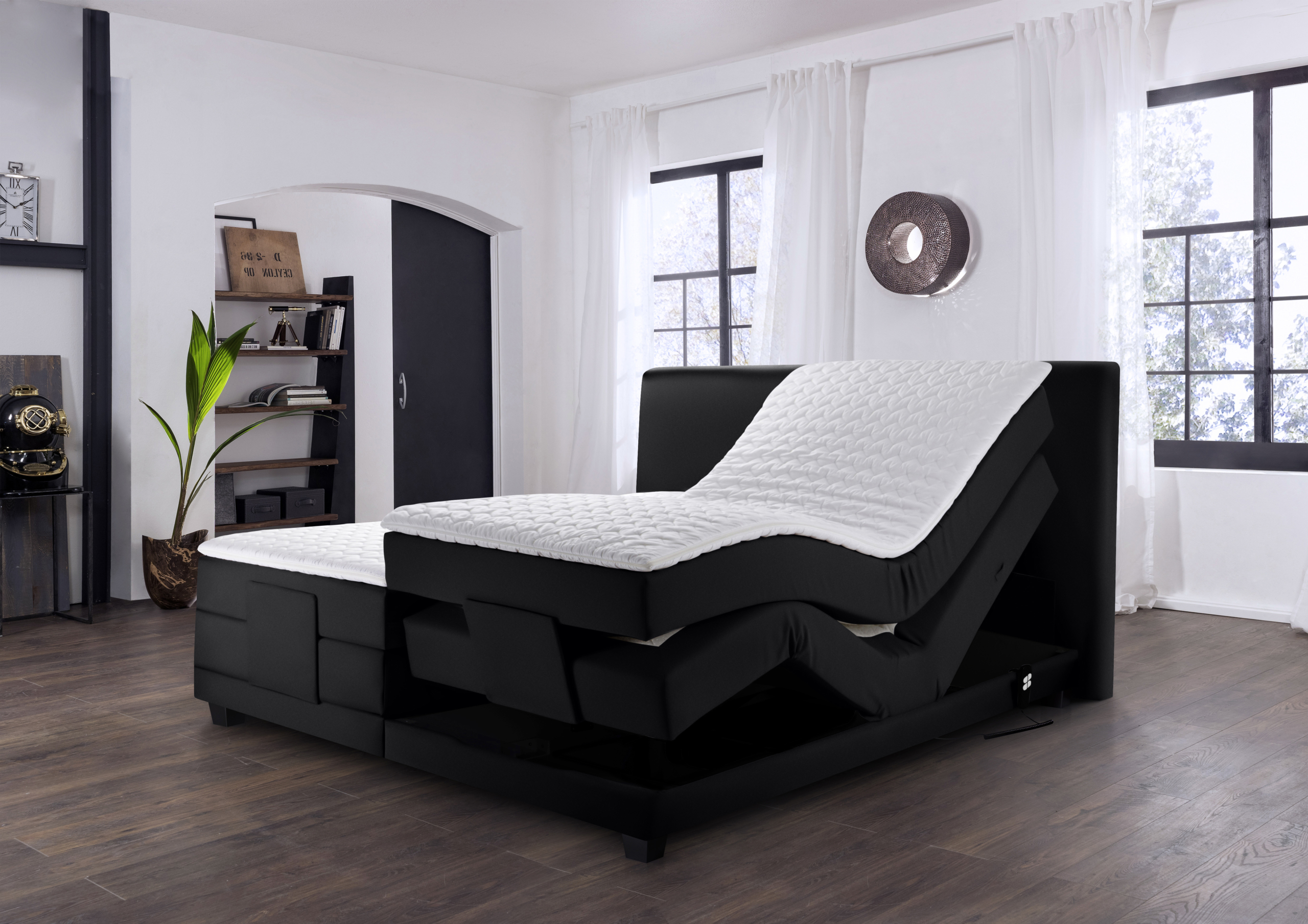 Unterbau: Fichtebox mit Bonellfederkern, motorisch verstellbar mit Kabelfernbedienung,