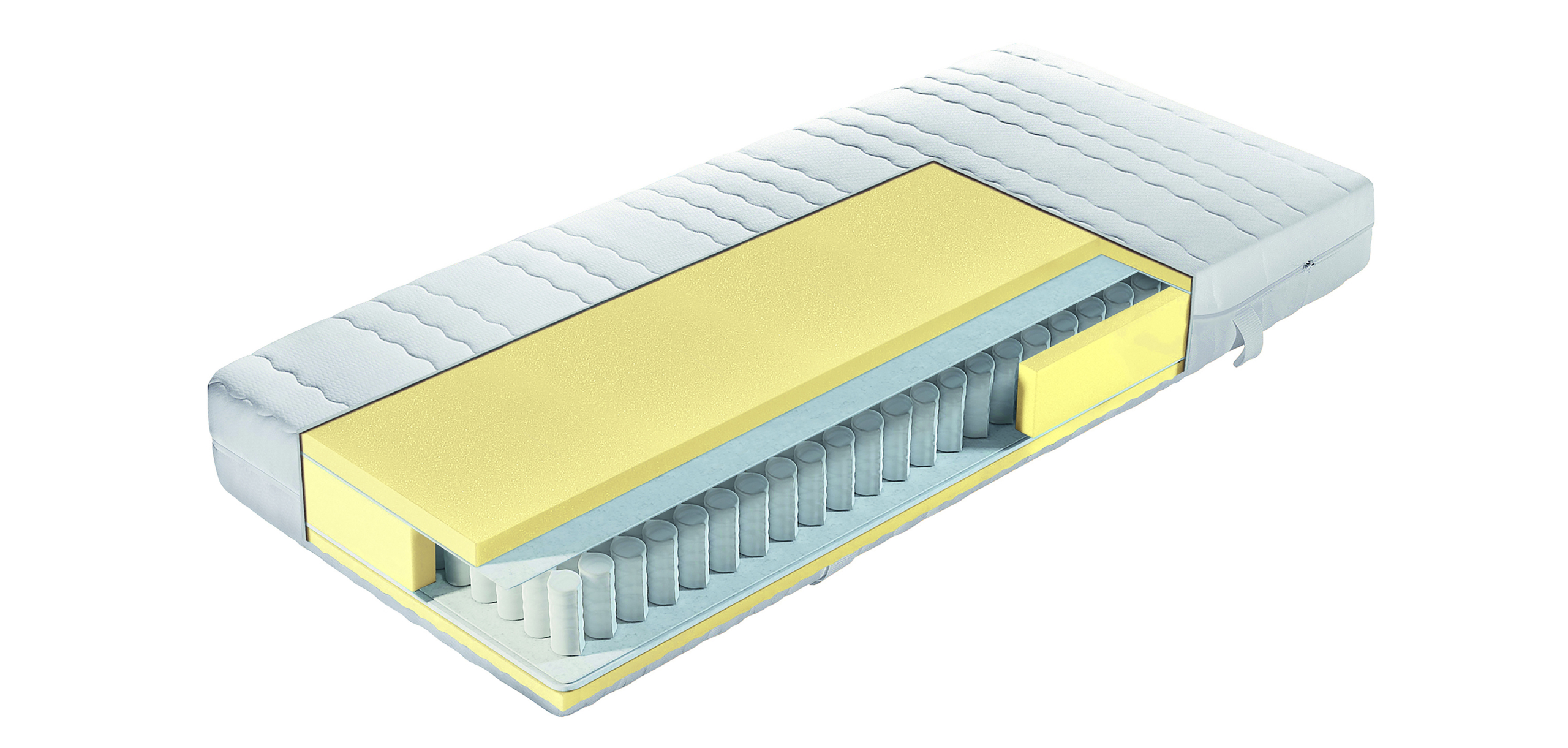 7-Zonen Taschenfederkern (12 cm) mit beidseitiger Comfortschaumabdeckung (2 cm) und hoher Punktelastizität durch 300 Federn*, besonders druckentlastend und temperaturausgleichend.