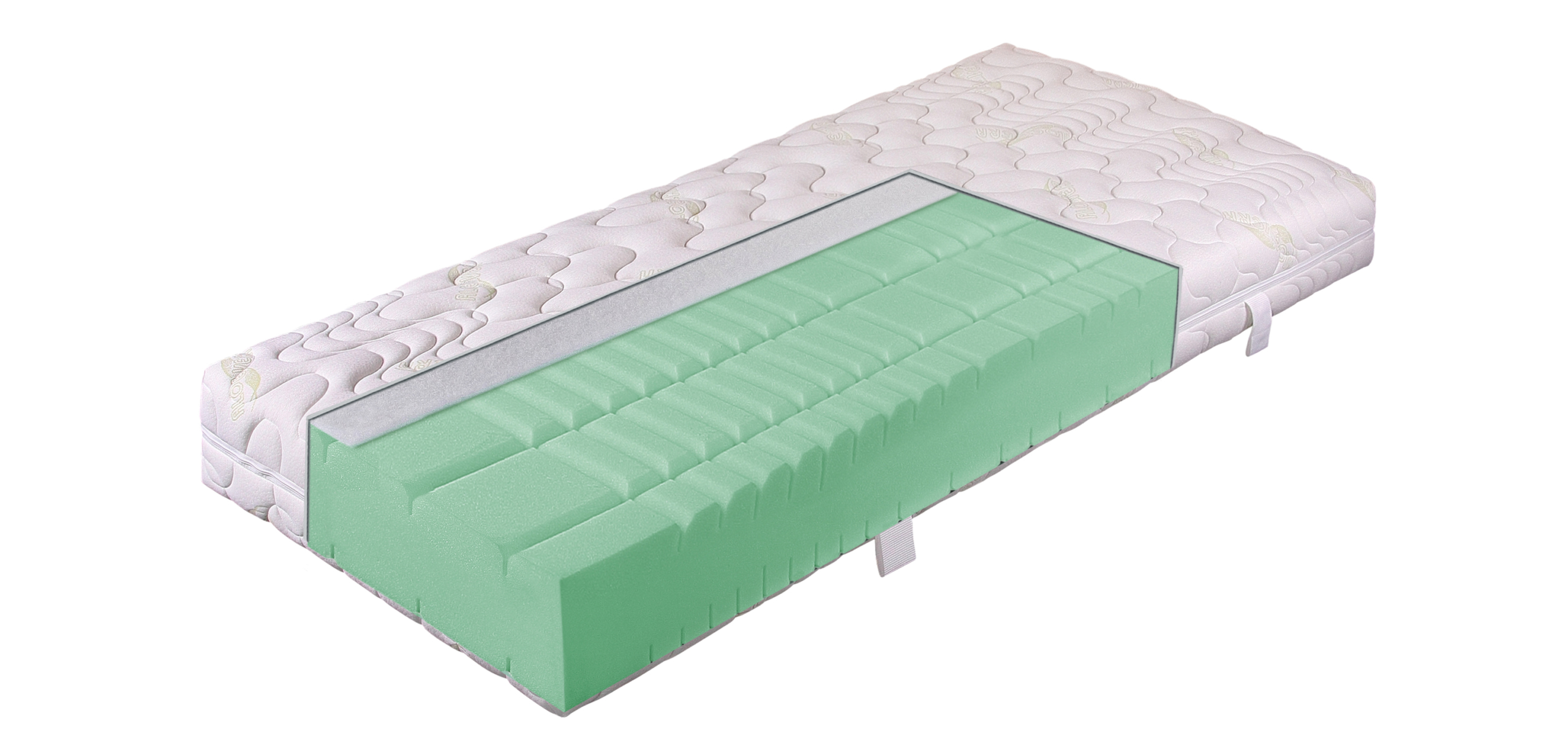 Hochwertiger Doppeltuchbezug aus 100% PES mit natürlichen Extrakten aus Blättern der Aloe-Vera Pflanze, Ober- und Unterseite mit Kilmafaser versteppt, durch 4-seitgen Reißververschluss teilbar und abnehmbar, waschbar bei 60°, ausschließliche Verwendung FCKW-freier Materialien, nach Oeko-Tex Standard 100, allergikergeeignet, 4 Handgriffe aus Gurtband, für leichtes Drehen und Wenden der Matratze.